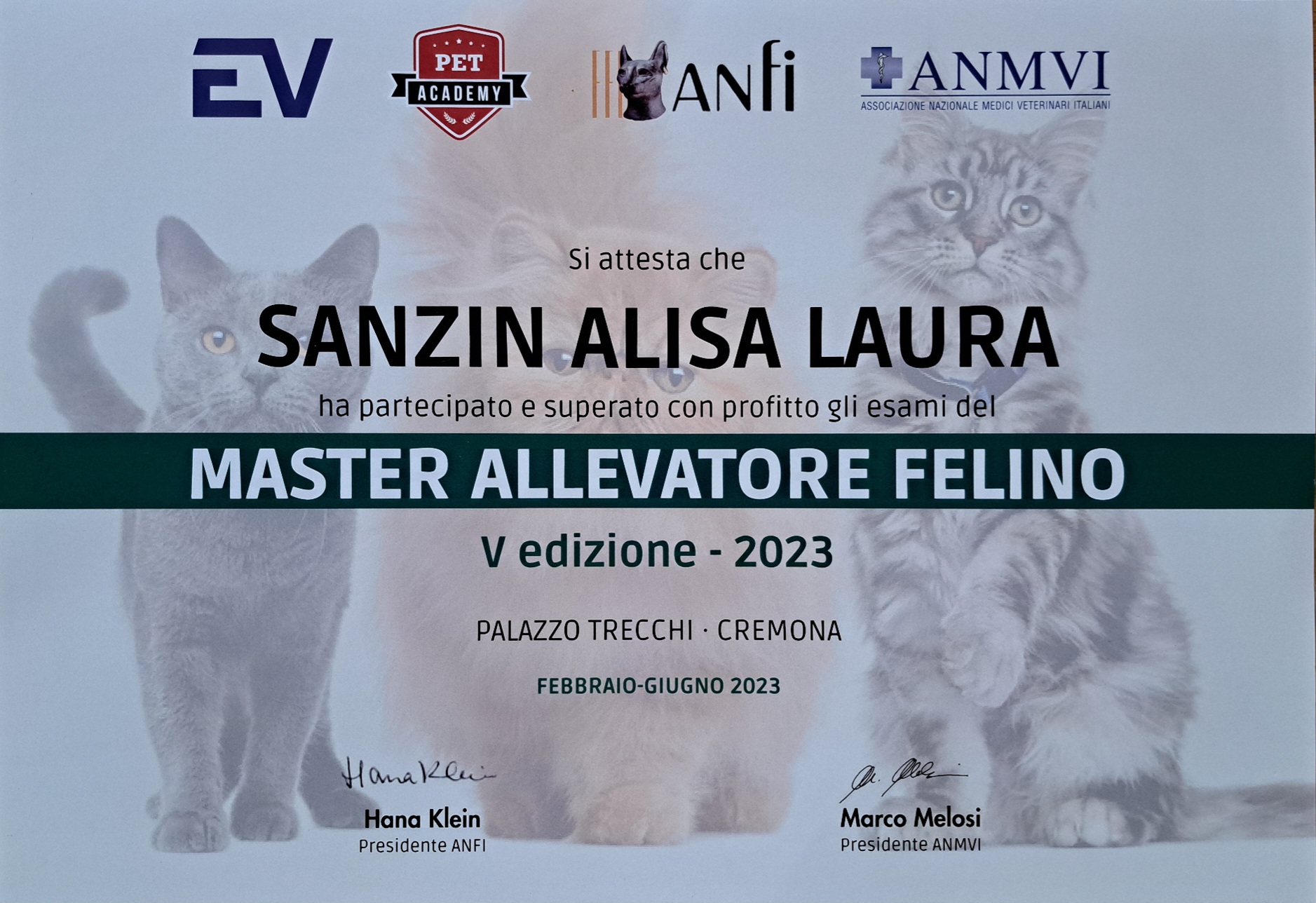 Nel 2023 ho superato con profitto gli esami del MASTER ALLEVATORE FELINO.